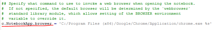 c.NotebookApp.browser 을 찾아서, 아래와 같이 크롬의 경로와 %s를 입력합니다. 주의할 점은 경로의 \ 를 /로 바꿔주셔야 된다는 것입니다. 아래 사진처럼 백슬레쉬를 슬레쉬로 바꿔줍니다.