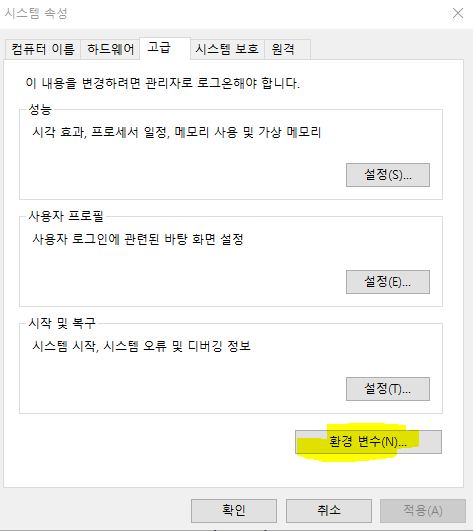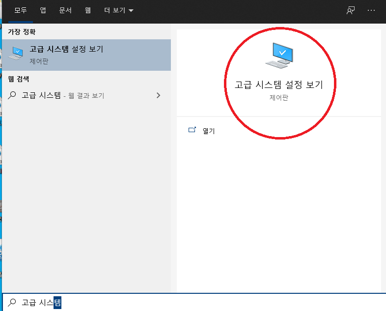 시작에서 '고급 시스템' 이라고 검색하면 아래 화면이 뜨는데 동그란 부분을 클릭합니다.