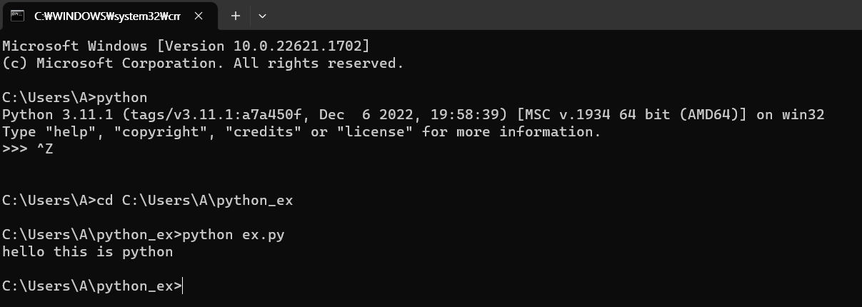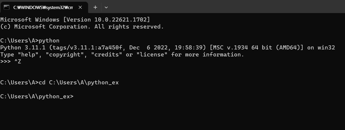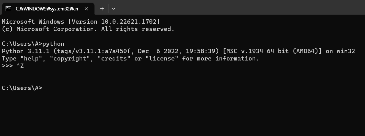 Ctrl+z 를 입력하고 엔터를 눌러 파이썬 대화형 환경을 종료합니다.