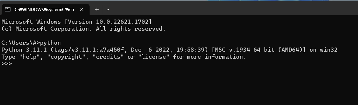python 이라고 입력해봅니다. 아래와 같이 파이썬의 대화형 환경이 실행됩니다. 만약 실행되지 않는다면 [내컴퓨터]-[속성]-[고급 시스템 설정]-[환경변수]-[사용자 변수] 의 Path 에 파이썬 exe 폴더 경로를 추가해주어야 합니다.